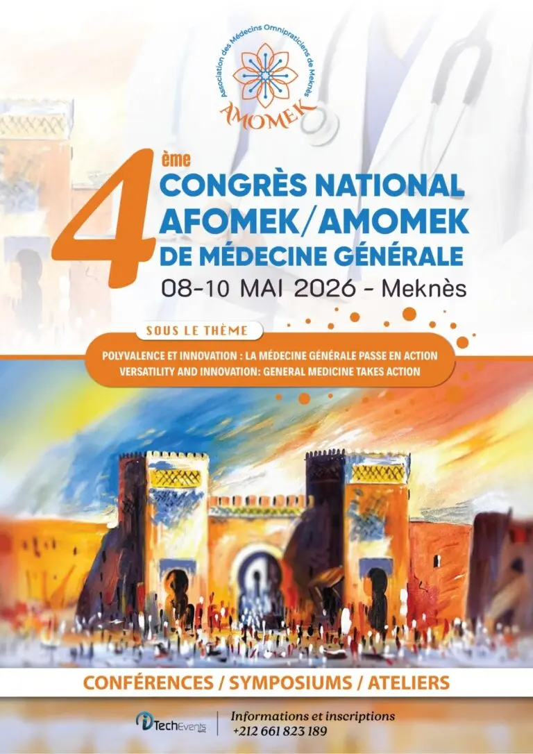 L’Association des Médecins Omnipraticiens de Meknès (AMOMEK) a l’honneur d’annoncer l’organisation du 4ème Congrès National de Médecine Générale, qui se déroulera du 08 au 10 mai 2026 à Meknès.